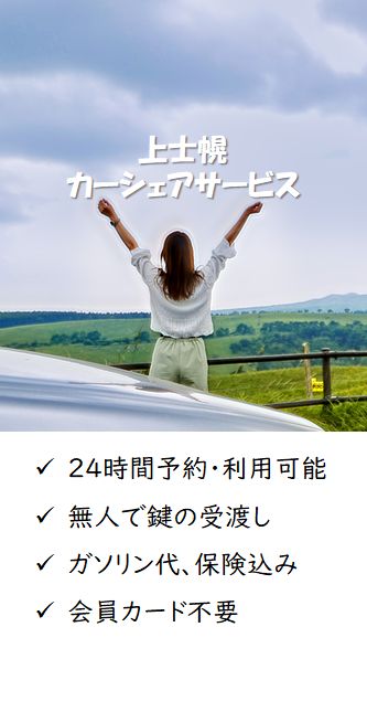 上士幌町にあるカーシェアサービスです。24時間予約・利用可能。無人で鍵の受け渡し。ガソリン代・保険込み。会員カードや会費不要